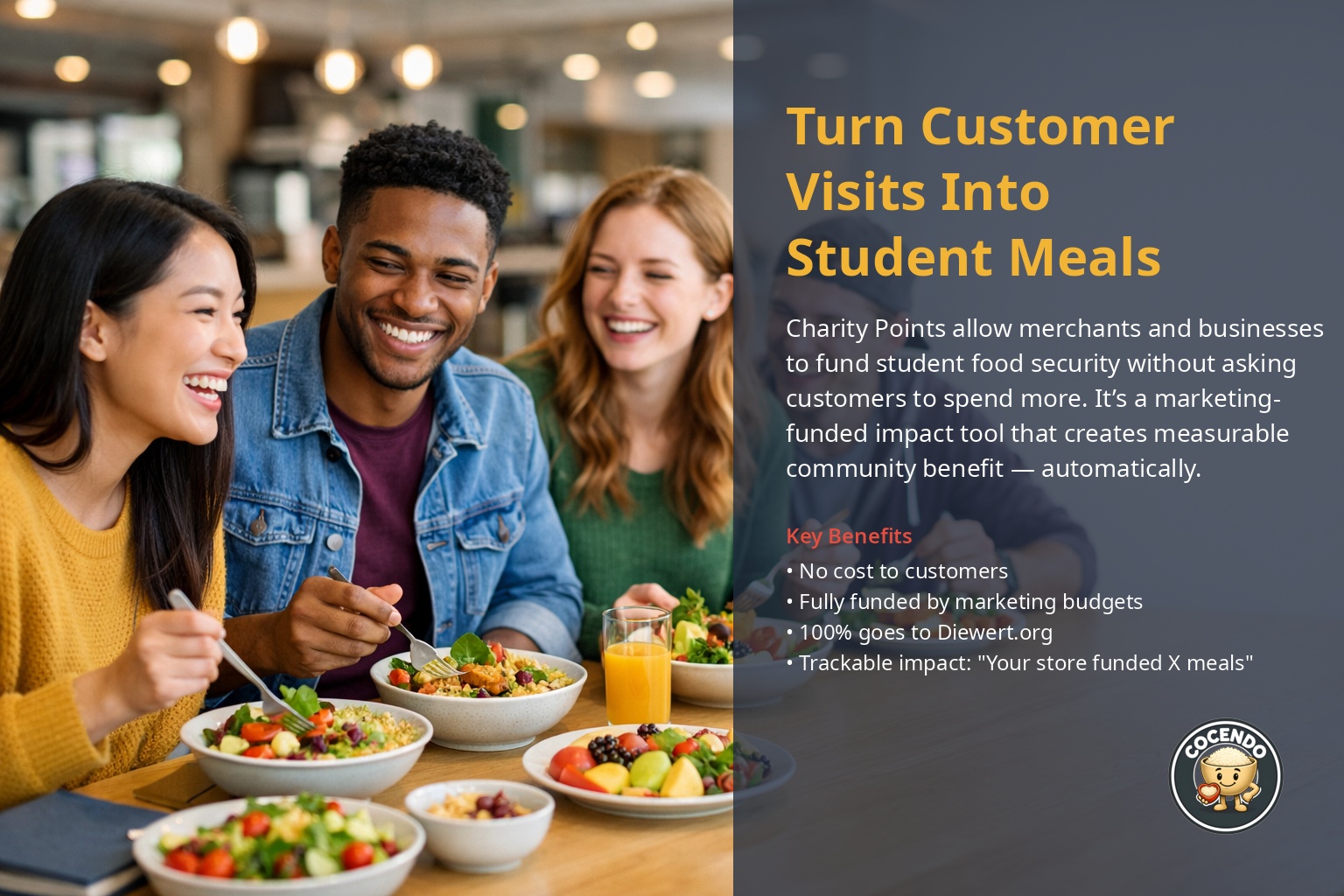 Join Cocendo’s Founding Phase! Become one of the first merchants or partners to activate a model where everyday purchases help feed students. Support the movement or contribute through our charitable partner. Make a Donation Now